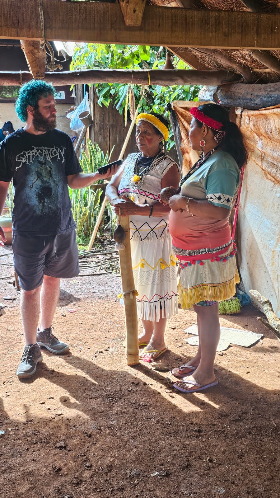 Além disso, foi promovido um diálogos com outros membros do Coletivo Okaragwyje Taperendy, como, Iziney Aquino Hilton – nascida na na aldeia Panambi Lagoa Rica, é filha de Joel Hilton e Terezinha Aquino. Desde criança, participa de grupos de canto tradicional, como Ñemongo’i e Okaragwyje Taperendy, e hoje é líder da comunidade Ita’y Ka’agwyrusu, atuando na preservação da cultura Kaiowá; e Cristiana Hilton Aquino, nascida na aldeia Panambi Lagoa Rica, é filha de Otilda Hilton e Demario Aquino. Estudou na Escola Joãozinho Carapé Fernandes e cursou o 1º ano do ensino médio no Colégio Barão do Rio Branco. Desde a infância, integrou grupos de canto tradicional, como Ñemongo’i e Okaragwyje Taperendy, além de atuar como artesã; também foi mantido diálogo com com jovens indígenas, entre eles Michele, cineasta, cuja atuação na produção audiovisual se destaca como um importante mecanismo de registro e valorização das narrativas indígenas. Também foi estabelecido contato com representantes da Organização REDE RAIS – Rede de Apoio e Incentivo Socioambiental, de Dourados – MS, com os quais foram discutidas estratégias de articulação e fortalecimento das práticas culturais indígenas em âmbito estadual.