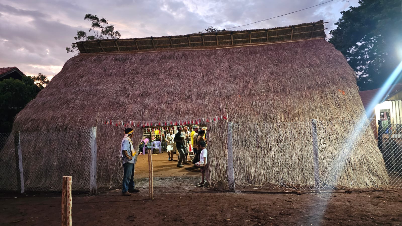 A equipe do Comitê de Cultura partiu de Campo Grande no dia 31/01/2025, às 13h30, chegando à Comunidade Indígena Itay Ka’agwyrusu por volta das 17h00. A recepção foi conduzida através de um ritual de boas-vindas, no qual os anfitriões entoaram rezas e cânticos sagrados enquanto acompanhavam os visitantes até a Oga Pysy (Casa de Reza), evidenciando o caráter de hospitalidade do evento, reforçando os princípios de reciprocidade e pertencimento que regem a dinâmica social dos Guarani e Kaiowá. O diálogo inicial foi estabelecido com o lider da retomada, Rogério Alziro, que revelou elementos centrais da trajetória da comunidade, relatando que a aldeia está instalada no local há 15 anos, enfrentando constantes ataques externos, incluindo o incêndio de três casas de reza ao longo desse período.