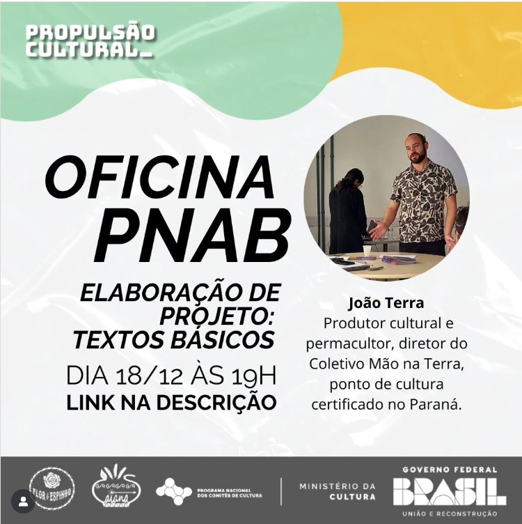 No dia 18 de dezembro de 2024, ocorreu a oficina “Propulsão – Elaboração de Projetos”, ministrada por João Terra, do Comitê de Cultura do Paraná. Com uma audiência de 97 visualizações, a sessão aprofundou os aspectos técnicos da escrita e estruturação de projetos culturais, abordando desde a concepção da ideia até a formatação de propostas que atendam aos critérios dos editais de fomento.